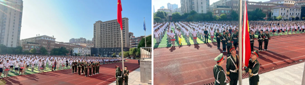護旗隊邁著整齊的步伐,莊嚴(yán)走向升旗臺,伴隨著莊嚴(yán)的《義勇軍進行曲》,鮮艷的五星紅旗在陽光下冉冉升起,全體師生莊嚴(yán)肅立。