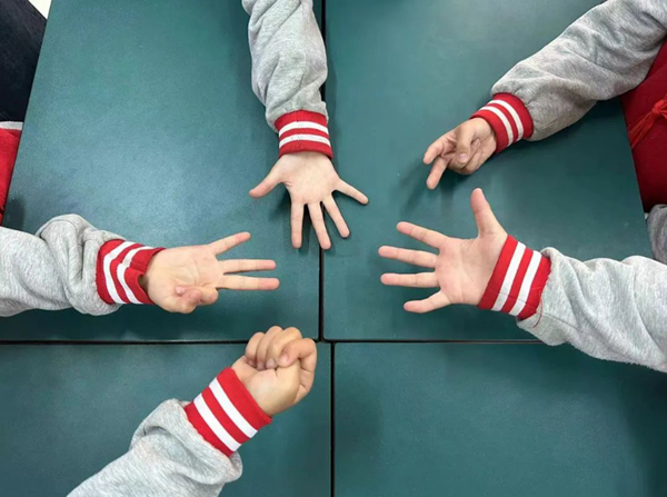 活動前老師給同學(xué)們講解了比賽規(guī)則:用手打節(jié)拍,喊出口令“加法猜猜拳”,同時(shí)伸出任意根數(shù)的手指,先算出手指之和的人獲勝。勝方得10分,輸方不得分。最后以班級為單位算出總得分。