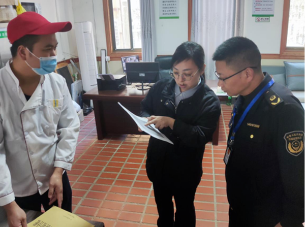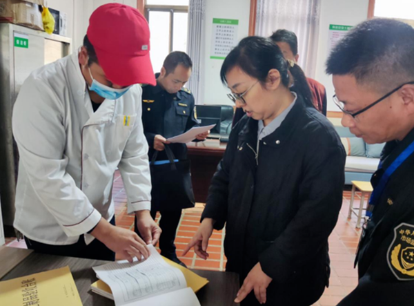 2023年11月21日下午,南昌縣縣委常委統(tǒng)戰(zhàn)部皮部長、八月湖街道辦市場監(jiān)管分局李局長一行深入我校全面檢查了學(xué)校食堂的臺賬情況及食品安全工作。