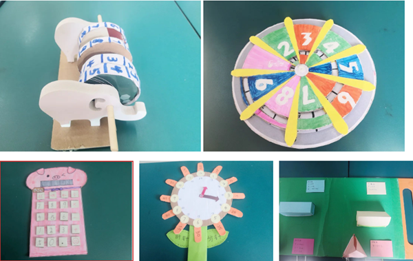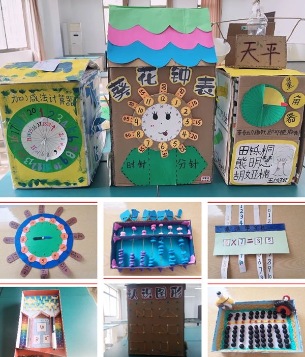 老師們在課堂中積極啟發(fā)學生奇思妙想,學生們充分利用家中的材料,發(fā)揮無限的想象力和創(chuàng)造力,制作了各式各樣的學具,有計數(shù)器、鐘表、直尺、天平、平行四邊形、數(shù)位順序表等。評委老師根據(jù)數(shù)學學具外形的美觀、構(gòu)思的巧妙以及實用性和操作性強等特點進行評選,優(yōu)秀作品琳瑯滿目。