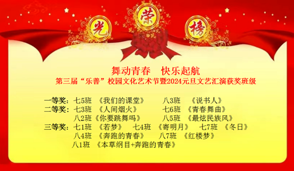 時(shí)光流轉(zhuǎn),青春的畫(huà)筆涂抹又一年的絢麗景象。在舊年新歲更替之際,我校第三屆樂(lè)善校園文化藝術(shù)節(jié)“舞動(dòng)青春 快樂(lè)起航”暨2024年元旦文藝匯演如約而至。學(xué)生和家長(zhǎng)們、老師們、領(lǐng)導(dǎo)嘉賓,歡聚一堂,喜迎新歲。
