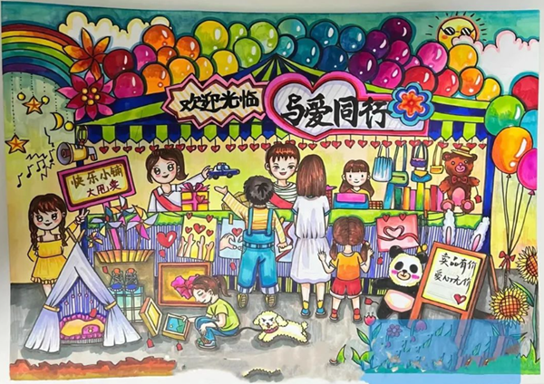 五年級和六年級的同學們也紛紛開始動手設(shè)計義賣攤位。瞧,他們設(shè)計的海報新穎獨特,色彩搭配和諧,內(nèi)容豐富有趣,讓人迫不及待地想去看看攤位上展示的物品呢!