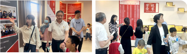 “導(dǎo)游”老師們?yōu)榧议L一一解說我校十四年來的辦學(xué)歷程、耀眼的中考成績、教育教學(xué)成果、育人理念及目標(biāo)和“樂善”校園文化。
